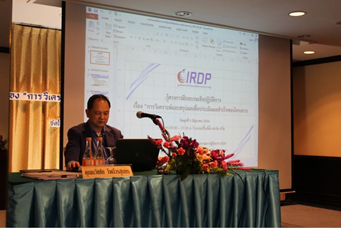 คุณสมชาย ไตรรัตนภิรมย์ รองกรรมการผู้จัดการ มูลนิธิสถาบันวิจัยและพัฒนาองค์กรภาครัฐ เป็นวิทยากร โครงการฝึกอบรมเชิงปฏิบัติการ เรื่อง “การวิเคราะห์และสรุปผลเพื่อประเมินผลสำเร็จของโครงการ” ในวันพุธที่ 5 มิถุนายน 2556 ณ โรงแรมปริ๊นส์ตั้น พาร์ค สวีท