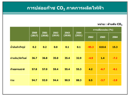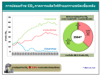 ภาคการผลิตไฟฟ้า มีการปล่อยก๊าซ CO2 ในปี 2564 ลดลงร้อยละ 2.9 เมื่อเทียบกับช่วงเดียวกันของปีก่อนโดยการปล่อยก๊าซ CO2 จากการใช้ถ่านหิน/ลิกไนต์อยู่ที่ระดับ 32.9 ล้านตัน CO2 ลดลงจากช่วงเดียวกันของปีก่อนร้อยละ 7.2 การปล่อยก๊าซ CO2 จากการใช้ก๊าซธรรมชาติในการผลิตไฟฟ้า ซึ่งมีสัดส่วน สูงสุด ร้อยละ 63 มีการปล่อยCO2 อยู่ที่ระดับ 55.3 ล้านตัน CO2 ลดลงเล็กน้อยจากช่วงเดียวกันของปีก่อน ร้อยละ 0.1 ในขณะที่การปล่อยก๊าซ CO2 จากการใช้น้ำมันสำเร็จรูปในการผลิตไฟฟ้ามีปริมาณเพียงเล็กน้อย ที่ระดับ 0.1 ล้านตัน CO2 มีการปล่อย CO2