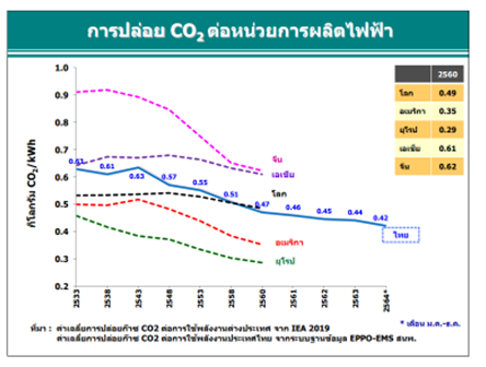 สำหรับการปล่อยก๊าซ CO2 ต่อหน่วยการผลิตไฟฟ้า (kWh) ในปี 2564 มีการปล่อยก๊าซ CO2 ต่อหน่วยการผลิตไฟฟ้าเฉลี่ยที่ระดับ 0.42 กิโลกรัม CO2 ต่อ 1 kWh ลดลงร้อยละ 4.6 เมื่อเทียบกับช่วงเดียวกันของปีก่อน เมื่อเปรียบเทียบการปล่อยก๊าซ CO2 ต่อ kWh ของประเทศไทยกับต่างประเทศ ในปี2560 ซึ่งเป็นข้อมูลล่าสุดของสำนักงานพลังงานระหว่างประเทศ (International Energy Agency : IEA) พบว่า ประเทศไทยมีการปล่อยก๊าซ CO2 ต่อหน่วยการผลิตไฟฟ้า อยู่ที่ระดับ 0.42 กิโลกรัม CO2 ต่อ 1 kWh ต่ำกว่า ค่าเฉลี่ยของประเทศในภูมิภาคเอเชีย (ไม่รวมประเทศจีน) และประเทศจีน ซึ่งมีการปล่อยก๊าซ CO2 เฉลี่ย ที่ระดับ 0.61 และ 0.62 กิโลกรัม CO2 ต่อ 1 kWh ตามลำดับ และต่ำกว่าค่าเฉลี่ยของโลกเล็กน้อย แต่อย่างไรก็ตาม ยังสูงกว่าประเทศสหรัฐอเมริกา และกลุ่มสหภาพยุโรป ที่มีการปล่อยก๊าซ CO2 อยู่ที่ระดับ 0.35 และ 0.29 กิโลกรัม CO2 ต่อ 1 kWh ตามลำดับ เนื่องจากปัจจัยด้านเชื้อเพลิงในการผลิตไฟฟ้าของประเทศพัฒนาแล้วที่มีการใช้นิวเคลียร์ซึ่งเป็นเชื้อเพลิงที่ไม่ก่อให้เกิดการ ปล่อยก๊าซ CO2 ซึ่งประเทศสหรัฐอเมริกา และกลุ่มสหภาพยุโรป มีการใช้นิวเคลียร์ในการผลิตไฟฟ้าคิดเป็นสัดส่วนร้อยละ 20 และ 22 ตามลำดับ รวมถึงการผลักดันและสนับสนุนการใช้พลังงานทดแทนเพื่อลดผลกระทบจากปัญหาการเปลี่ยนแปลงสภาพภูมิอากาศที่ทวี ความรุนแรงขึ้น ทำให้หลายประเทศรวมทั้งประเทศไทย มีการใช้พลังงานทดแทนในการผลิตไฟฟ้าเพิ่มมากขึ้น จึงทำให้การปล่อยก๊าซ CO2 ต่อ kWh มีแนวโน้มลดลงอย่างต่อเนื่อง